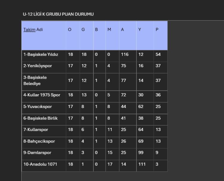 Bu sezon ise oynadığı 18 maçın hepsinden galip ayrıldı. Son maçında Bahçecikspor’u 7-2 mağlup etti. Takımın Teknik Sorumlusu Tolga Dalkırsın, futbol okullarından çıkan minik futbolcularla bu başarıyı yakaladıklarını belirterek, “U-12 yaş grubunda çok iyi bir jenerasyon yakaladık. Çok yetenekliler. Çok çalışarak başarılı olduk. Minik sporcularımızı kutluyor, bizlerin hep yanında olan ailelerine de çok teşekkür ediyoruz” dedi.