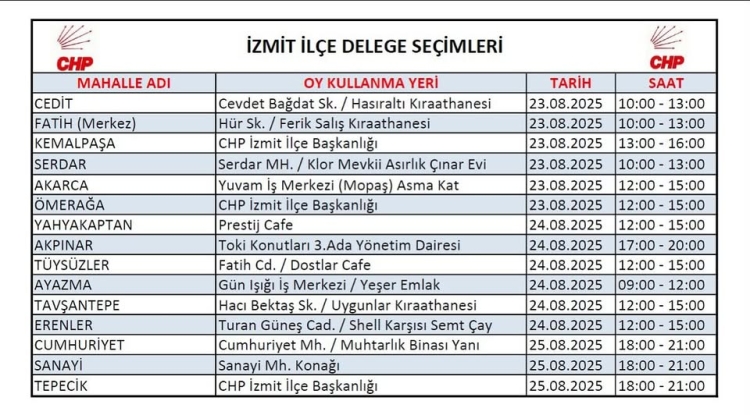 Cumhuriyet Halk Partisi İzmit İlçe Başkanlığı, 23 Ağustos Cumartesi, 24 Ağustos Pazar ve 25 Ağustos Pazartesi günleri yapılacak delege seçimlerinin takvimini belirledi. 3 günde 15 mahallede sandık kurulacak ve delegeler belirlenecek.