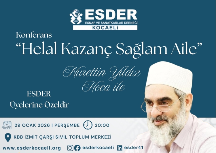 Türkiye Esnaf ve Sanatkarlar Derneği (ESDER) Kocaeli Şubesi, 29 Ocak Perşembe günü Kocaeli Büyükşehir Belediyesi’ne bağlı İzmit Sivil Toplum Merkezi’nde bir konferans düzenliyor.
