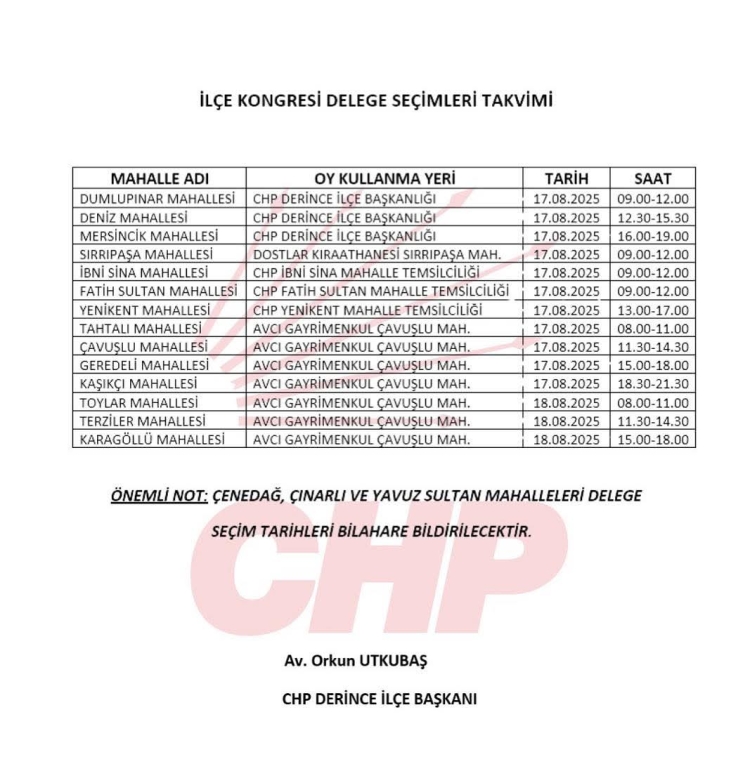 Derince İlçe Örgütü tarafından yapılan açıklamada 18 Ağustos Pazartesi günü, saat 08.00 ile 11.00 arasında Toylar Mahallesi, 11.30 ile 14.30 arasında Terziler Mahallesi ve 15.00 ile 18.00 saatleri arasında Karagöllü Mahallesi için delege seçimi yapılacak. Bu 3 mahalledeki seçim de Çavuşlu Mahallesi’ndeki Avcı Gayrimenkul’de gerçekleşecek.