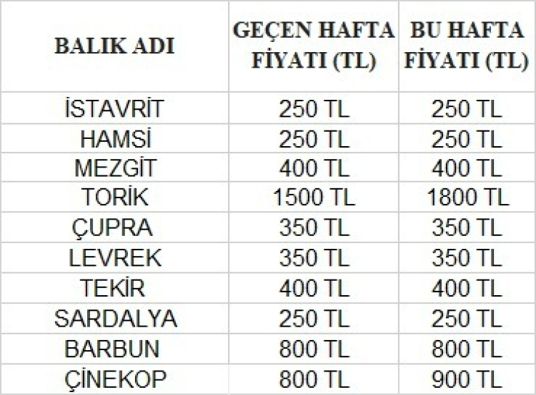 Geçtiğimiz hafta bol miktarda avlanan ve kilosu 1500 TL’den satılan torik, bu hafta 1800 TL’den alıcı buluyor. Önceki hafta 800 liradan satılan çinekop ise bu hafta 900 liradan veriliyor.