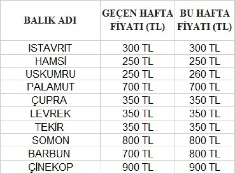 İzmit Balıkhan’da bulunan iş yerlerinde büyük ve küçük balıklar yer alıyor. Hamsi 250, tekir 350, istavrit 300, palamut 700, barbun 800, çinekop ise 900 liradan satıldı. İş yeri sahipleri denizlerdeki fırtınaya karşın tezgahlarda balık bulunduğunu vurgularken, tüketicilerde, balığın kırmız etten ucuz olduğunu belirttiler.