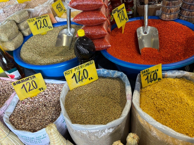 Pazarda özellikle bakliyat tezgahlarında yoğunluk yaşanırken, en çok rağbet gören ürünlerin başında ise mercimek, nohut, fasulye ve bulgur geliyor.