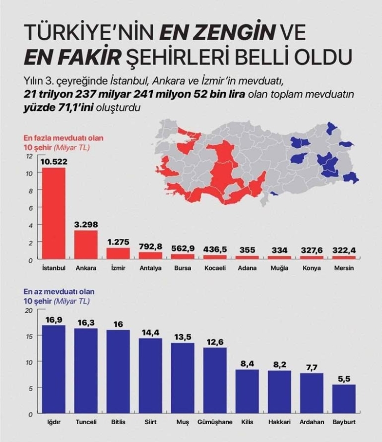 En fazla mevduata sahip ilk üç şehir İstanbul (10 trilyon 522 milyar TL), Ankara (3 trilyon 298 milyar TL) ve İzmir (1 trilyon 275 milyar TL) olurken; Kocaeli bu şehirleri Antalya ve Bursa’nın ardından izledi.