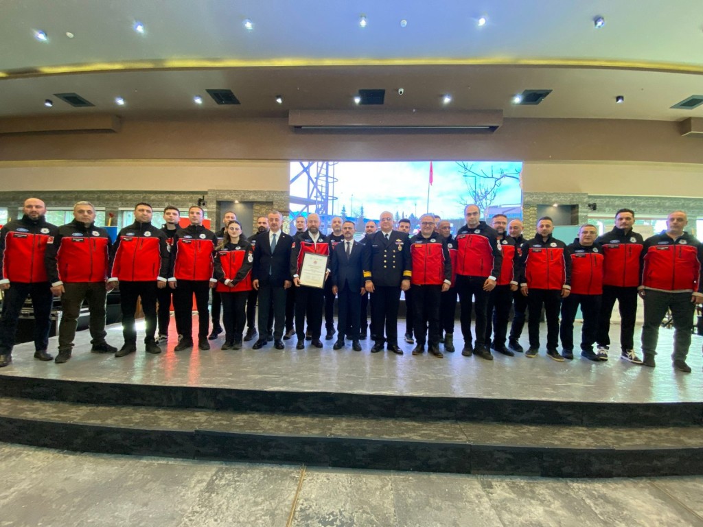 Asrın Felaketi 6 Şubat depremlerinin yıl dönümü kapsamında Kocaeli’de görev yapan arama kurtarma ekipleri için arma teslim programı düzenlendi.
