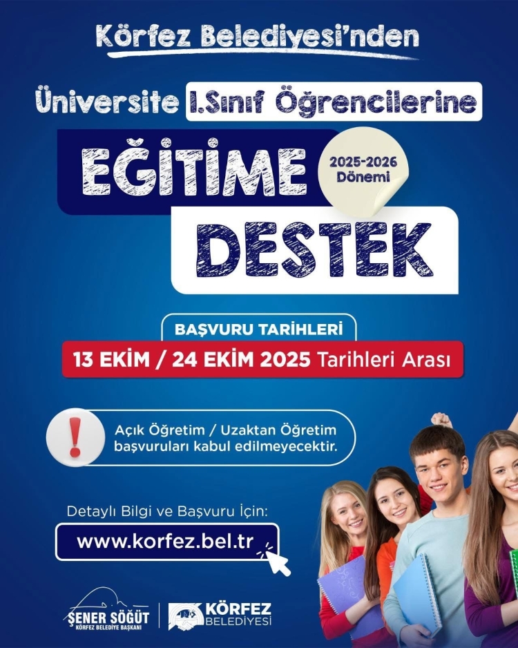 Körfez Belediyesi, her yıl olduğu gibi bu yıl da üniversiteye yeni başlayan gençlere destek oluyor. 2025-2026 eğitim döneminde üniversite 1. sınıf öğrencilerine yönelik eğitim desteği başvuruları 13 Ekim itibariyle başladı. Başvurular, www.korfez.bel.tr adresi üzerinden çevrimiçi olarak yapılabilecek. Son başvuru tarihi de 24 Ekim olarak belirtildi.