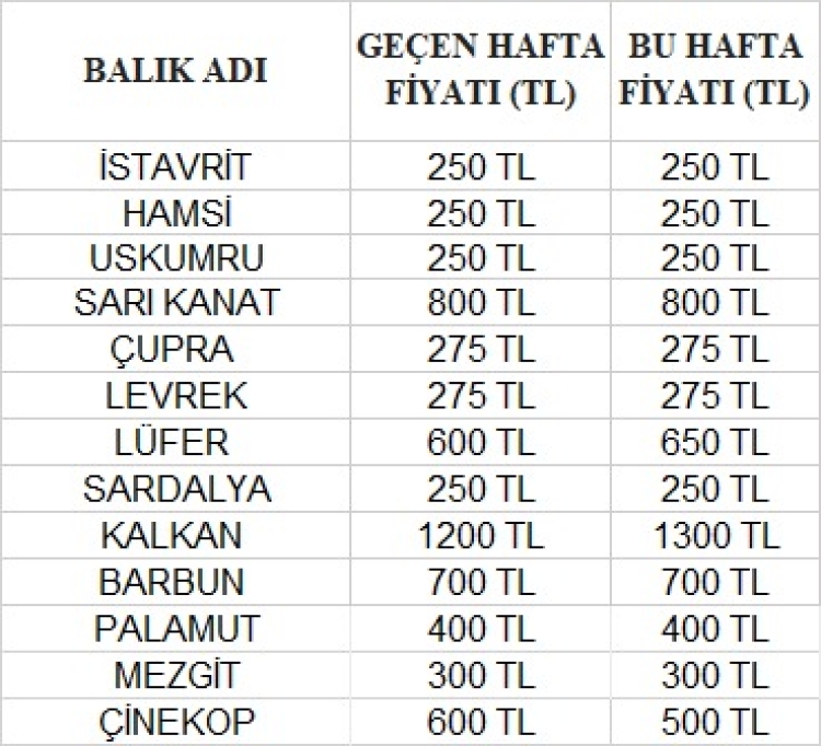 Geçen hafta 600 TL olan lüferin kilosu bu hafta 650 TL’ye yükselirken, kalkan balığı da 1200 TL’den 1300 TL’ye çıktı. Palamut 400 TL, barbun 700 TL’den satılmaya devam ederken, çinekop ise 600 TL’den 500 TL’ye düştü.