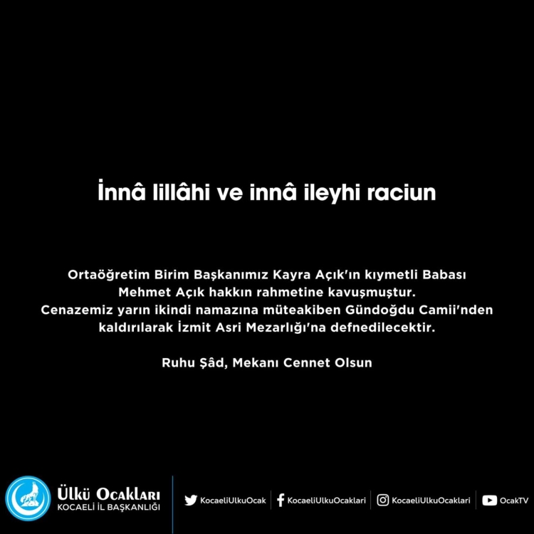 Kocaeli Ülkü Ocakları Ortaöğretim Birim Başkanı Kayra Açık’ın babası Mehmet Açık, vefat etmiştir. Cenaze töreni, 18 Ocak Pazar günü ikindi namazını müteakiben Gündoğdu Camii’nden kaldırılarak İzmit Asri Mezarlığı’na defnedilecektir.